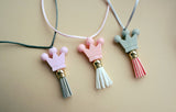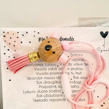 Pakabukas suvertas iš silikono ir medinių karoliukų, odinio kutoso. Užsegimas stipriau patraukus atsisega, todėl saugus naudoti vaikučiams.